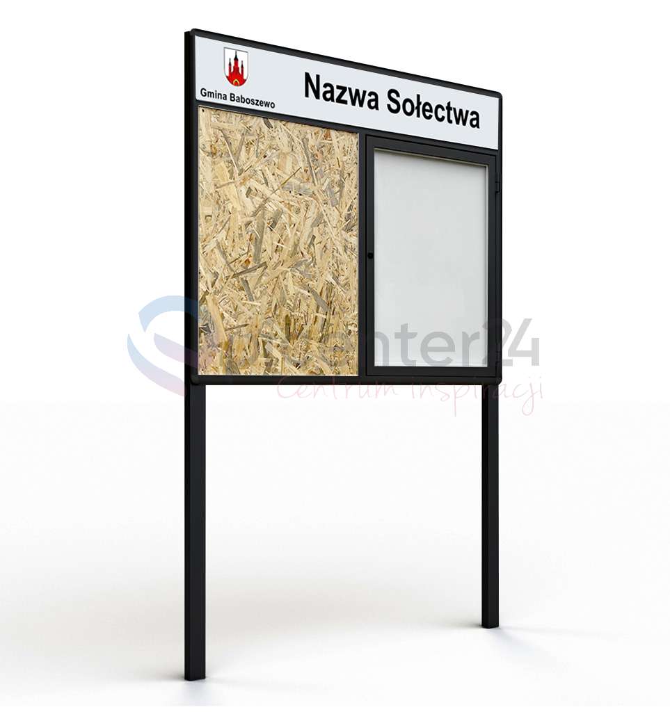 Gablota sołecka 100x130 cm z gablotą i płytą OSB w kolorze czarnym - udostępnia otwartą powierzchnię do samodzielnego mocowania treści przez mieszkańców.